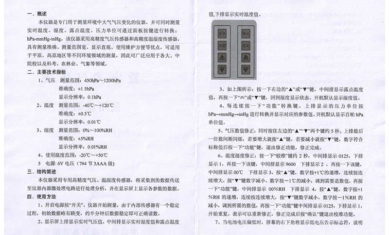 概述:本儀器是專門用於測量環境中大氣氣壓變化的儀器,並可同時測量實時溫度,濕度,露點溫度。儀器采用高精度氣壓傳感器和高精度溫濕度傳感器,具有測量準確,測量範圍寬,顯示直觀,使用維護方便等優點,可適用於平原高原地區等不同環境領域的測量,因此可廣泛應用於氣象,軍事,航海,地質,工礦,各大,中院校以及科考,等領域。